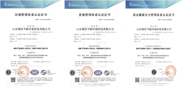 2018year6In the month, Shandong Shenxin Energy Saving and Environmental Protection Technology Co., Ltd. passed the quality management system certification again (registration number:064-16-Q-2538-R0-S),Environmental Management System Certification (Registration Number:064-16-E-2539-R0-S), Occupational Health and Safety Management System Certification (Registration Number:064-16-S-2540-R0-S) certification test.