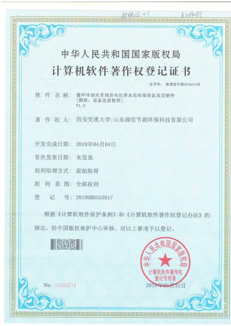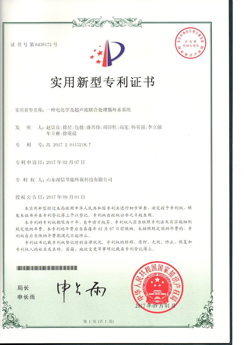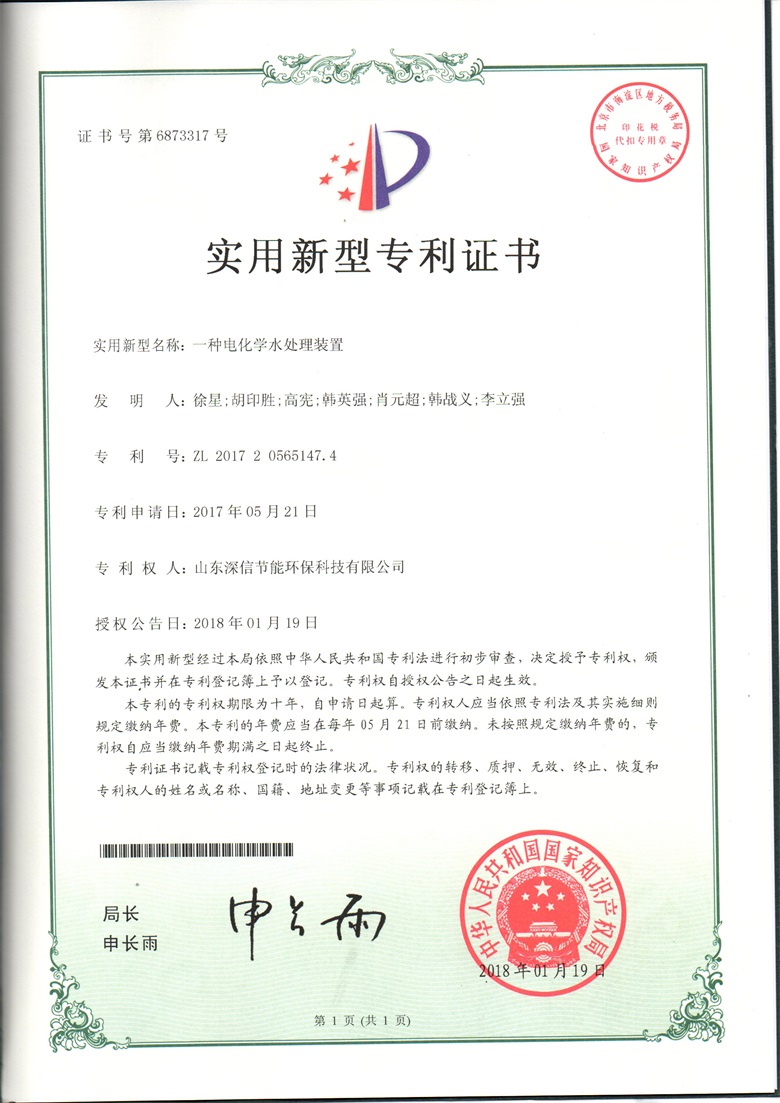Recently, our company's invention patent on the "Selection Method of Electrochemical Descaling Equipment for Circulating Cooling Water System" was successfully passed. Patent No:ZL 2016 1 1236675.1. The invention belongs to the field of electrochemical technology, and particularly relates to a method for selecting an electrochemical descaling device for circulating cooling water system, which fills a blank in the field of domestic electrochemical technology and lays a solid foundation for the development of the electrochemical water treatment industry. The basis of theoretical development. | |